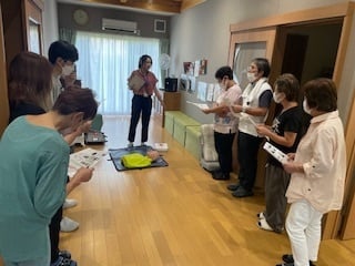 よつば荘でAED講習会を実施しました。利用者の安全確保が第一です。初めてAEDに触れる方もいて勉強になったようです。
